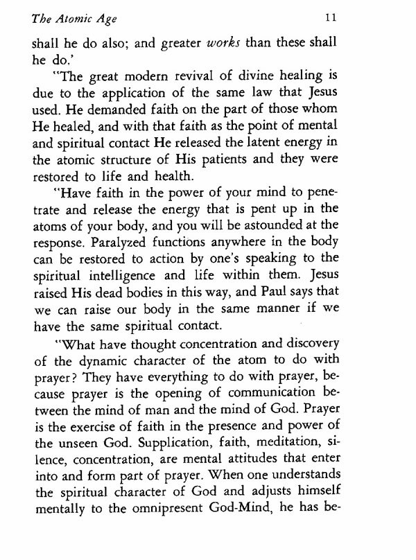 "The great modern revival of divine healing is due to the application of the same law that Jesus used. He demanded faith on the part of those whom He healed, and with that faith as the point of mental and spiritual contact He released the latent energy in the atomic structure of His patients and they were restored to life and health.