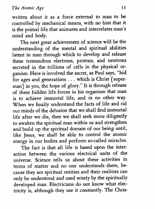 The next great achievement of science will be the understanding of the mental and spiritual abilities latent in man through which to develop and release these tremendous electrons, protons, and neutrons secreted in the trillions of cells in the physical organism. Here is involved the secret, as Paul says, "hid for ages and generations . . . which is Christ [superman] in you, the hope of glory." It is through release of these hidden life forces in his organism that man is to achieve immortal life, and in no other way. When we finally understand thefacts of life and rid our minds of the delusion that we shall find immortal life after we die, then we shall seek more diligently to awaken the spiritual man within us and strengthen and build up the spiritual domain of our being until, like Jesus, we shall be able to control the atomic energy in our bodies and perform so-called miracles.