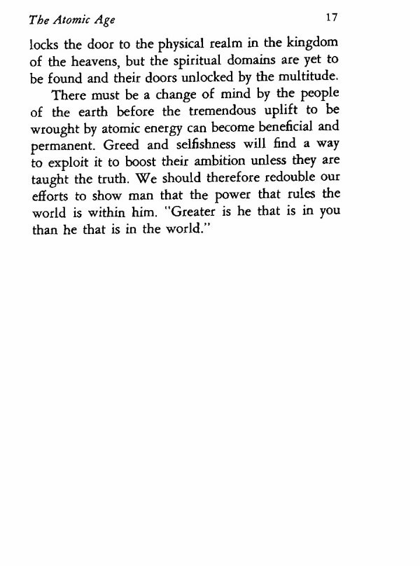the door to the physical realm in the kingdom of the heavens, but the spiritual domains are yet to be found and their doors unlocked by the multitude. There must be a change of mind by the people of the earth before the tremendous uplift to be wrought by atomic energy can become beneficial and permanent. Greed and selfishness will find a way to exploit it to boost their ambition unless they are taught the truth. We should therefore redouble our efforts to show man that the power that rules the world is within him. "Greater is he that is in you than he that is in the world." |