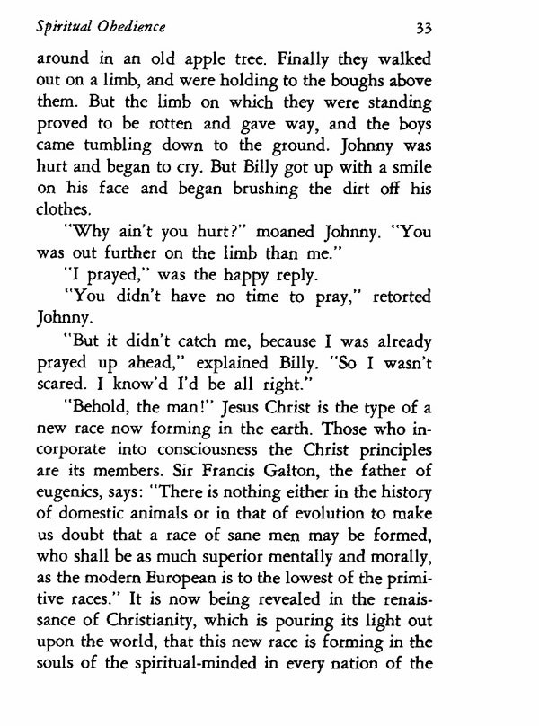 "Behold, the man!" Jesus Christ is the type of a new race now forming in the earth. Those who incorporate into consciousness the Christ principles are its members. Sir Francis Galton, the father of eugenics, says: "There is nothing either in the history of domestic animals or in that of evolution to make us doubt that a race of sane men may be formed, who shall be as much superior mentally and morally, as the modern European is to the lowest of the primitive races." It is now being revealed in the renaissance of Christianity, which is pouring its light out upon the world, that this new race is forming in the souls of the spiritual-minded in every nation of the