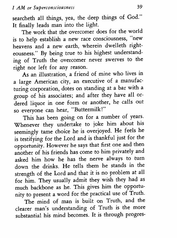 This has been going on for a number of years. Whenever they undertake to joke him about his seemingly tame choice he is overjoyed. He feels he is testifying for the Lord and is thankful just for the opportunity. However he says that first one and then another of his friends has come to him privately and asked him how he has the nerve always to turn down the drinks. He tells them he stands in the strength of the Lord and that it is no problem at all for him. They usually admit they wish they had as much backbone as he. This gives him the opportunity to present a word for the practical use of Truth.