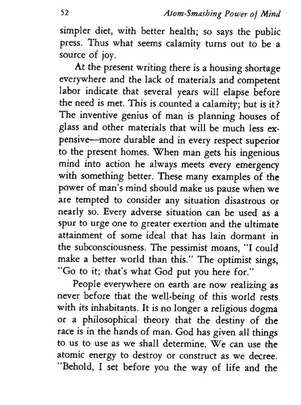 At the present writing there is a housing shortage everywhere and the lack of materials and competent labor indicate that several years will elapse before the need is met. This is counted a calamity; but is it? The inventive genius of man is planning houses of glass and other materials that will be much less expensive--more durable and in every respect superior to the present homes. When man gets his ingenious mind into action he always meets every emergency with something better. These many examples of the power of man's mind should make us pause when we are tempted to consider any situation disastrous or nearly so. Every adverse situation can be used as a spur to urge one to greater exertion and the ultimate attainment of some ideal that has lain dormant in the subconsciousness. The pessimist moans, "I could make a better world than this." The optimist sings, "Go to it; that's what God put you here for."