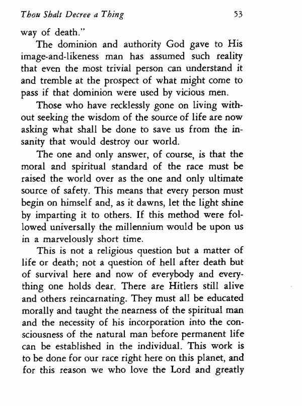 This is not a religious question but a matter of life or death; not a question of hell after death but of survival here and now of everybody and everything one holds dear. There are Hitlers still alive and others reincarnating. They must all be educated morally and taught the nearness of the spiritual man and the necessity of his incorporation into the consciousness of the natural man before permanent life can be established in the individual. This work is to be done for our race right here on this planet, and for this reason we who love the Lord and greatly