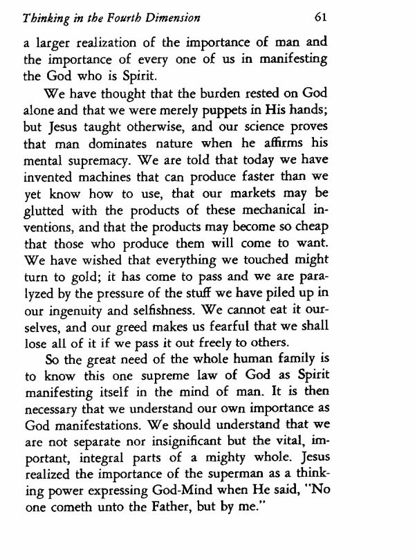 So the great need of the whole human family is to know this one supreme law of God as Spirit manifesting itself in the mind of man. It is then necessary that we understand our own importance as God manifestations. We should understand that we are not separate nor insignificant but the vital, important, integral parts of a mighty whole. Jesus realized the importance of the superman as a thinking power expressing God-Mind when He said, "No one cometh unto the Father, but by me."