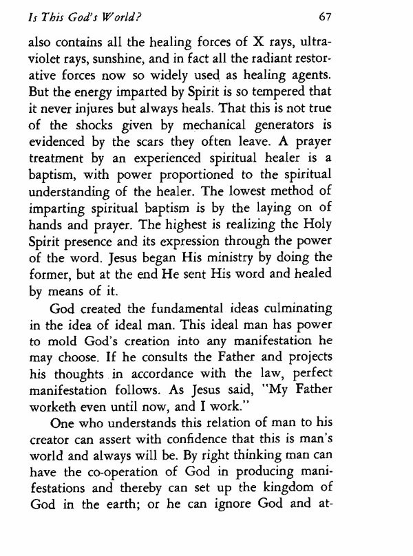 One who understands this relation of man to his creator can assert with confidence that this is man's world and always will be. By right thinking man can have the co-operation of God in producing manifestations and thereby can set up the kingdom of God in the earth; or he can ignore God and attempt