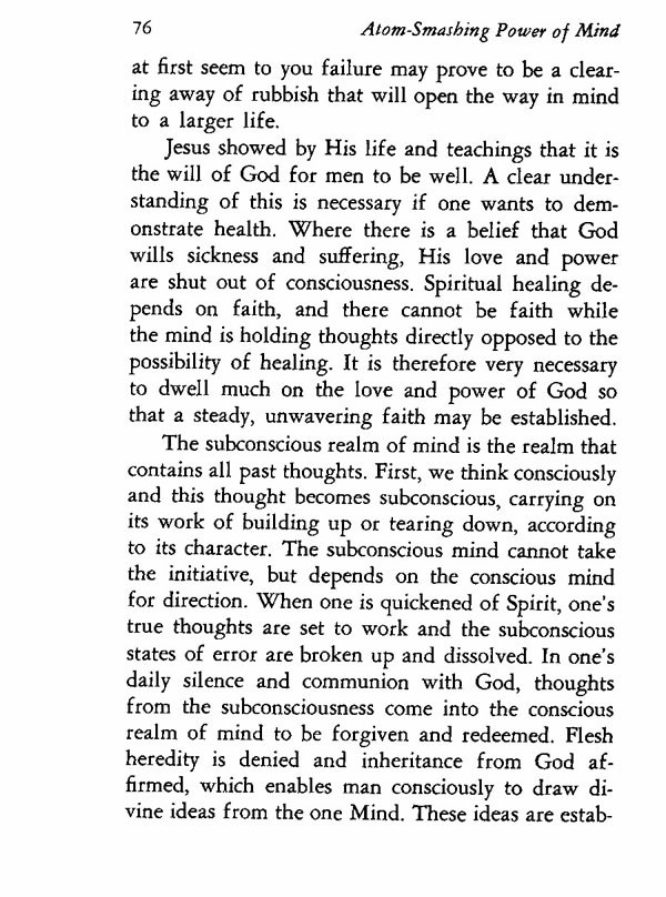 The subconscious realm of mind is the realm that contains all past thoughts. First, we think consciously and this thought becomes subconscious, carrying on its work of building up or tearing down, according to its character.The subconscious mind cannot take the initiative, but depends on the conscious mind for direction. When one is quickened of Spirit, one's true thoughts are set to work and the subconscious states of error are broken up and dissolved. In one's daily silence and communion with God, thoughts from the subconsciousness come into the conscious realm of mind to be forgiven and redeemed. Flesh heredity is denied and inheritance from God affirmed, which enables man consciously to draw divine ideas from the one Mind. These ideas are established