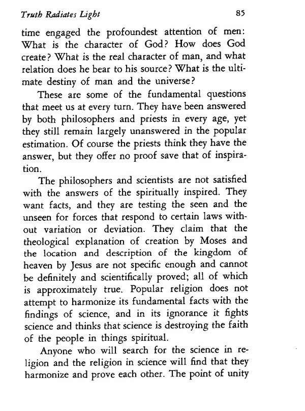 These are some of the fundamental questions that meet us at every turn. They have been answered by both philosophers and priests in every age, yet they still remain largely unanswered in the popular estimation. Of course the priests think they have the answer, but they offer no proof save that of inspiration. The philosophers and scientists are not satisfied with the answers of the spiritually inspired. They want facts, and they are testing the seen and the unseen for forces that respond to certain laws without variation or deviation. They claim that the theological explanation of creation by Moses and the location and description of the kingdom of heaven by Jesus are not specific enough and cannot be definitely and scientifically proved; all of which is approximately true. Popular religion does not attempt to harmonize its fundamental facts with the findings of science, and in its ignorance it fights science and thinks that science is destroying the faith of the people in things spiritual.