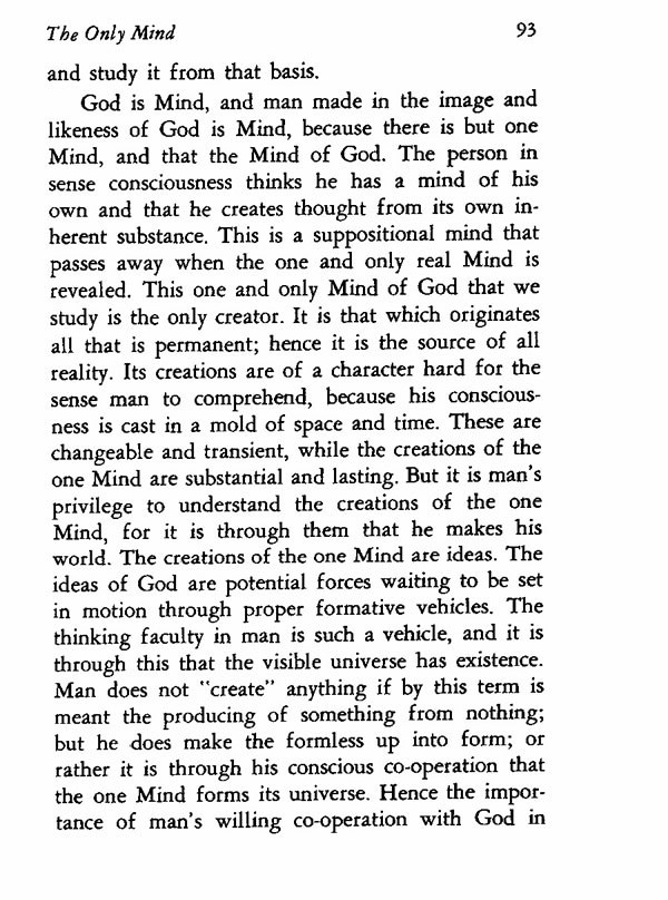 God is Mind, and man made in the image and likeness of God is Mind, because there is but one Mind, and that the Mind of God. The person in sense consciousness thinks he has a mind of his own and that he creates thought from its own inherent substance. This is a suppositional mind that passes away when the one and only real Mind is revealed. This one and only Mind of God that we study is the only creator. It is that which originates all that is permanent; hence it is the source of all reality. Its creations are of a character hard for the sense man to comprehend, because his consciousness is cast in a mold of space and time. These are changeable and transient, while the creations of the one Mind are substantial and lasting. But it is man's privilege to understand the creations of the one Mind, for it is through them that he makes his world. The creations of the one Mind are ideas. The ideas of God are potential forces waiting to be set in motion through proper formative vehicles. The thinking faculty in man is such a vehicle, and it is through this that the visible universe has existence. Man does not "create" anything if by this term is meant the producing of something from nothing; but he does make the formless up into form; or rather it is through his conscious co-operation that the one Mind forms its universe. Hence the importance of man's willing co-operation with God in
