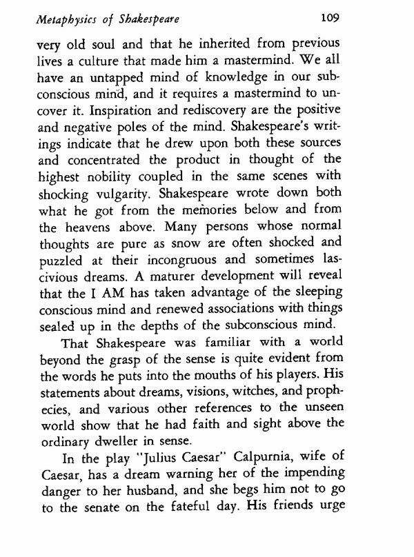 very old soul and that he inherited from previous lives a culture that made him a mastermind. We all have an untapped mind of knowledge in our subconscious mind, and it requires a mastermind to uncover it. Inspiration and rediscovery are the positive and negative poles of the mind. Shakespeare's writings indicate that he drew upon both these sources and concentrated the product in thought of the highest nobility coupled in the same scenes with shocking vulgarity. Shakespeare wrote down both what he got from the memories below and from the heavens above. Many persons whose normal thoughts are pure as snow are often shocked and puzzled at their incongruous and sometimes lascivious dreams. A maturer development will reveal that the I AM has taken advantage of the sleeping conscious mind and renewed associations with things sealed up in the depths of the subconscious mind.