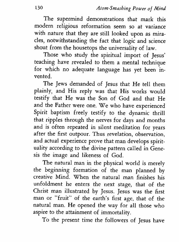 The Jews demanded of Jesus that He tell them plainly, and His reply was that His works would testify that He was the Son of God and that He and the Father were one. We who have experienced Spirit baptism freely testify to the dynamic thrill that ripples through the nerves for days and months and is often repeated in silent meditation for years after the first outpour. Thus revelation, observation, and actual experience prove that man develops spirituality according to the divine pattern called in Genesis the image and likeness of God.