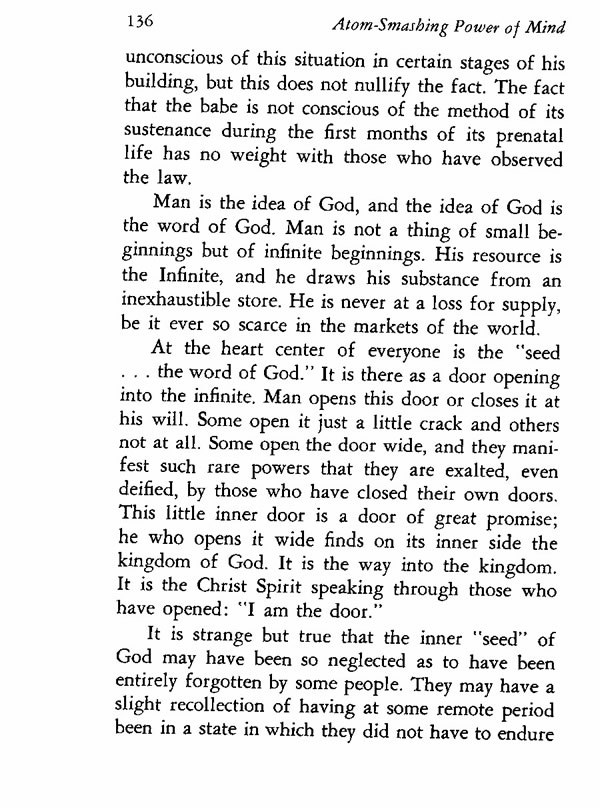 At the heart center of everyone is the "seed . . . the word of God." It is there as a door opening into the infinite. Man opens this door or closes it at his will. Some open it just a little crack and others not at all. Some open the door wide, and they manifest such rare powers that they are exalted, even deified, by those who have closed their own doors. This little inner door is a door of great promise; he who opens it wide finds on its inner side the kingdom of God. It is the way into the kingdom. It is the Christ Spirit speaking through those who have opened: "I am the door."