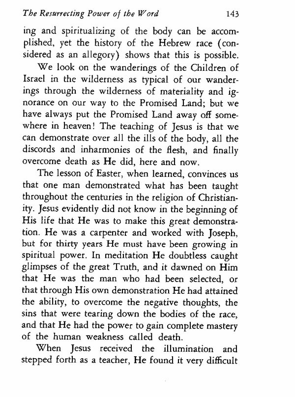 We look on the wanderings of the Children of Israel in the wilderness as typical of our wanderings through the wilderness of materiality and ignorance on our way to the Promised Land; but we have always put the Promised Land away off somewhere in heaven! The teaching of Jesus is that we can demonstrate over all the ills of the body, all the discords and inharmonies of the flesh, and finally overcome death as He did, here and now.