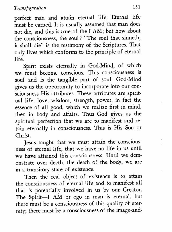 perfect man and attain eternal life. Eternal life must be earned. It is usually assumed that man does not die, and this is true of the I AM; but how about the consciousness, the soul? "The soul that sinneth, it shall die" is the testimony of the Scriptures. That only lives which conforms to the principle of eternal life.
