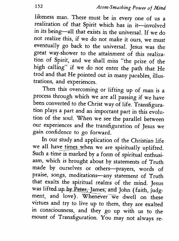 In our study and application of the Christian life we all have times when we are spiritually uplifted. Such a time is marked by a form of spiritual enthusiasm, which is brought about by statements of Truth made by ourselves or others--prayers, words of praise, songs, meditations--any statement of Truth that exalts the spiritual realms of the mind. Jesus was lifted up by Peter, James, and John (faith, judgment, and love). Whenever we dwell on these virtues and try to live up to them, they are exalted in consciousness, and they go up with us to the mount of Transfiguration. You may not always realize