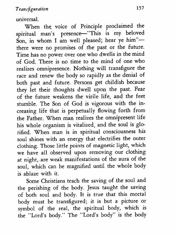 When the voice of Principle proclaimed the spiritual man's presence--"This is my beloved Son, in whom I am well pleased; hear ye him"--there were no promises of the past or the future. Time has no power over one who dwells in the mind of God. There is no time to the mind of one who realizes omnipresence. Nothing will transfigure the race and renew the body so rapidly as the denial of both past and future. Persons get childish because they let their thoughts dwell upon the past. Fear of the future weakens the virile life, and the feet stumble. The Son of God is vigorous with the increasing life that is perpetually flowing forth from the Father. When man realizes the omnipresent life his whole organism is vitalized, and the soul is glorified. When man is in spiritual consciousness his soul shines with an energy that electrifies the outer clothing. Those little points of magnetic light, which we have all observed upon removing our clothing at night, are weak manifestations of the aura of the soul, which can be magnified until the whole body is ablaze with it.