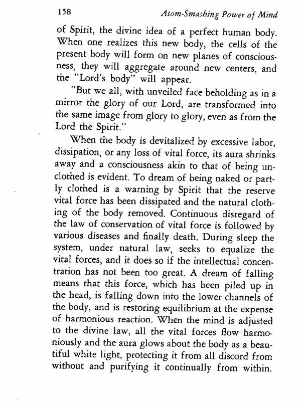When the body is devitalized by excessive labor, dissipation, or any loss of vital force, its aura shrinks away and a consciousness akin to that of being unclothed is evident. To dream of being naked or partly clothed is a warning by Spirit that the reserve vital force has been dissipated and the natural clothing of the body removed. Continuous disregard of the law of conservation of vital force is followed by various diseases and finally death. During sleep the system, under natural law, seeks to equalize the vital forces, and it does so if the intellectual concentration has not been too great. A dream of falling means that this force, which has been piled up in the head, is falling down into the lower channels of the body, and is restoring equilibrium at the expense of harmonious reaction. When the mind is adjusted to the divine law, all the vital forces flow harmoniously and the aura glows about the body as a beautiful white light, protecting it from all discord from without and purifying it continually from within