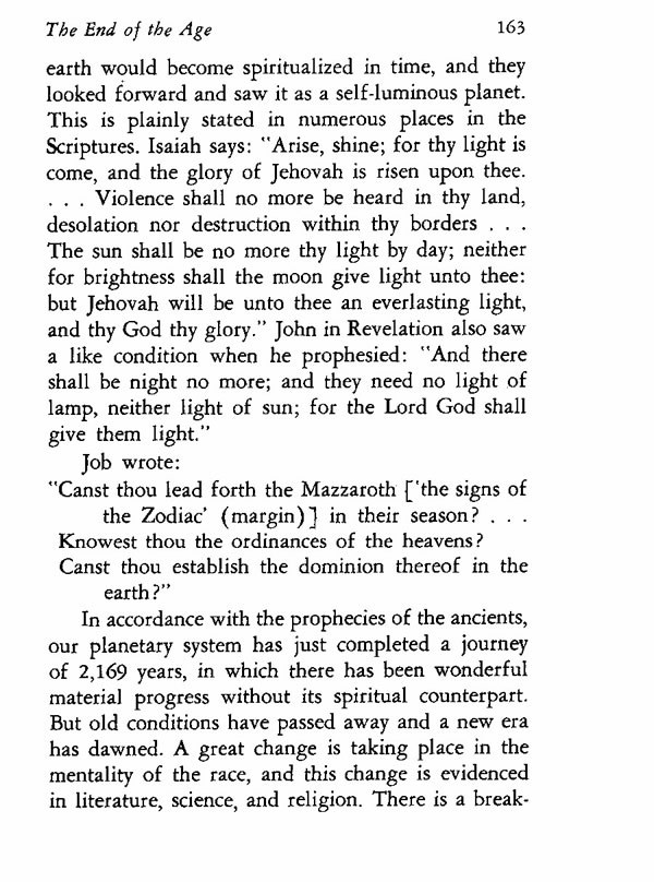 In accordance with the prophecies of the ancients, our planetary system has just completed a journey of 2,169 years, in which there has been wonderful material progress without its spiritual counterpart. But old conditions have passed away and a new era has dawned. A great change is taking place in the mentality of the race, and this change is evidenced in literature, science, and religion. There is a breaking