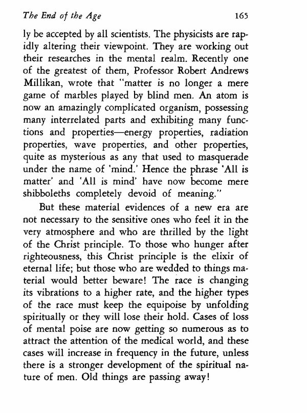 be accepted by all scientists. The physicists are rapidly altering their viewpoint. They are working out their researches in the mental realm. Recently one of the greatest of them, Professor Robert Andrews Millikan, wrote that "matter is no longer a mere game of marbles played by blind men. An atom is now an amazingly complicated organism, possessing many interrelated parts and exhibiting many functions and properties--energy properties, radiation properties, wave properties, and other properties, quite as mysterious as any that used to masquerade under the name of 'mind.' Hence the phrase 'All is matter' and 'All is mind' have now become mere shibboleths completely devoid of meaning."