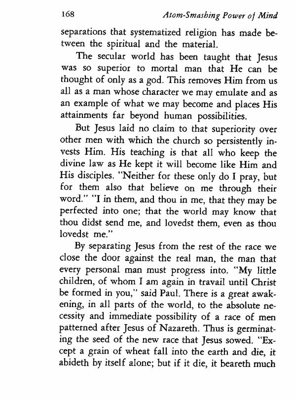By separating Jesus from the rest of the race we close the door against the real man, the man that every personal man must progress into. "My little children, of whom I am again in travail until Christ be formed in you," said Paul. There is a great awakening, in all parts of the world, to the absolute necessity and immediate possibility of a race of men patterned after Jesus of Nazareth. Thus is germinating the seed of the new race that Jesus sowed. "Except a grain of wheat fall into the earth and die, it abideth by itself alone; but if it die, it beareth much