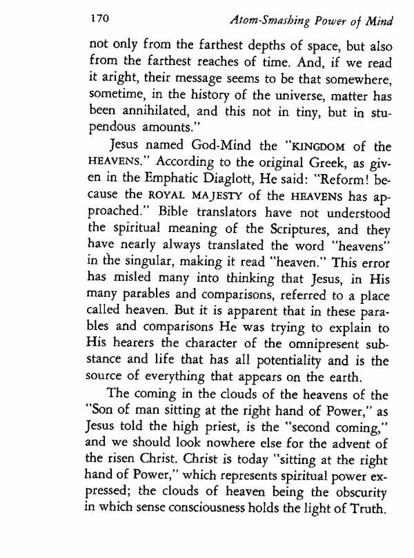 Jesus named God-Mind the "KINGDOM of the HEAVENS." According to the original Greek, as given in the Emphatic Diaglott, He said: "Reform! because the ROYAL MAJESTY of the HEAVENS has approached." Bible translators have not understood the spiritual meaning of the Scriptures, and they have nearly always translated the word "heavens" in the singular, making it read "heaven." This error has misled many into thinking that Jesus, in His many parables and comparisons, referred to a place called heaven. But it is apparent that in these parables and comparisons He was trying to explain to His hearers the character of the omnipresent substance and life that has all potentiality and is the source of everything that appears on the earth.