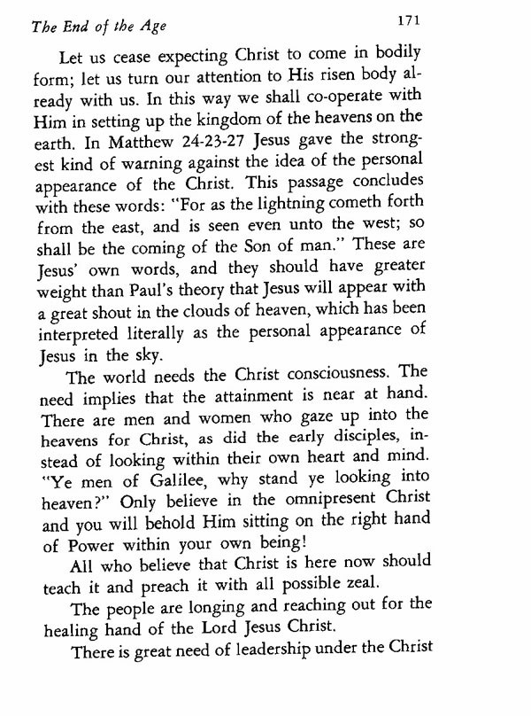 Let us cease expecting Christ to come in bodily form; let us turn our attention to His risen body already with us. In this way we shall co-operate with Him in setting up the kingdom of the heavens on the earth. In Matthew 24-23-27 Jesus gave the strongest kind of warning against the idea of the personal appearance of the Christ. This passage concludes with these words: "For as the lightning cometh forth from the east, and is seen even unto the west; so shall be the coming of the Son of man." These are Jesus' own words, and they should have greater weight than Paul's theory that Jesus will appear with a great shout in the clouds of heaven, which has been interpreted literally as the personal appearance of Jesus in the sky.