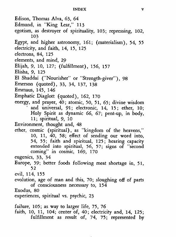 energy, and prayer, 40; atomic, 50, 51, 65; divine wisdom and universal, 91; electronic, 14, 15; ether, 10; Holy Spirit as dynamic 66, 67; pent-up, in body, 11; spiritual, 9, 10