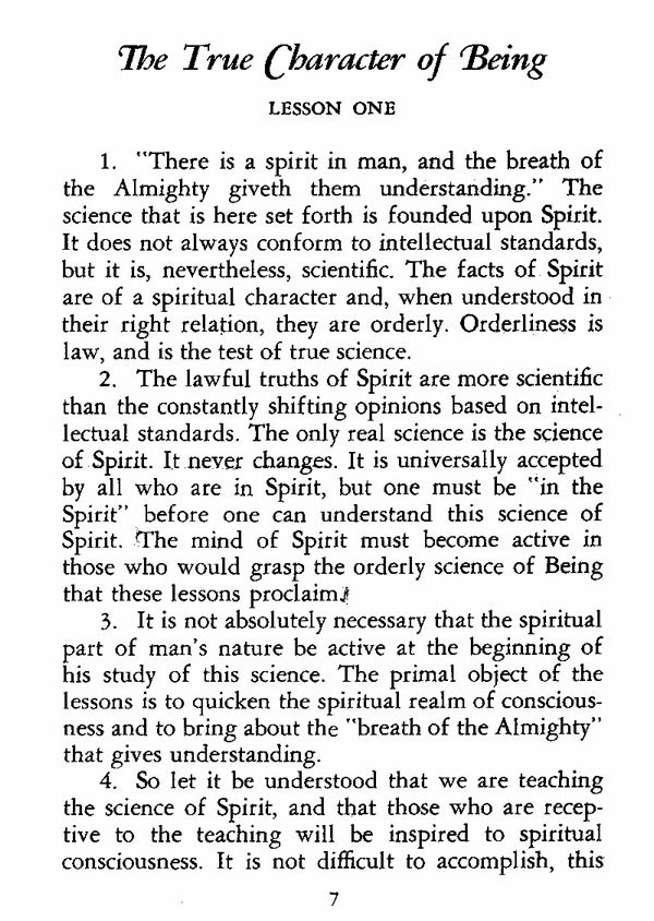 1. "There is a spirit in man, and the breath of the Almighty giveth them understanding." The science that is here set forth is founded upon Spirit. It does not always conform to intellectual standards, but it is, nevertheless, scientific. The facts of Spirit are of a spiritual character and, when understood in their right relation, they are orderly. Orderliness is law, and is the test of true science.