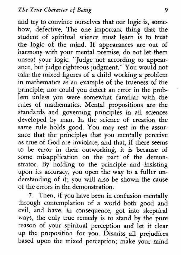 and try to convince ourselves that our logic is, somehow, defective. The one important thing that the student of spiritual science must learn is to trust the logic of mind. If appearances are out of harmony with your mental premise, do not let them unseat your logic. "Judge not according to appearance, but judge righteous judgment." You would not take the mixed figures of a child working a problem in mathematics as an example of the trueness of the principle; nor could you detect an error in the problem unless you were somewhat familiar with the rules of mathematics. Mental propositions are the standards and governing principles in all sciences developed by man. In the science of creation the same rule holds good. You may rest in the assurance that the principles that you mentally perceive as true of God are inviolate, and that, if there seems to be error in their outworking, it is because of some misapplication on the part of the demonstrator. By holding to the principle and insisting upon its accuracy, you open the way to a fuller understanding of it; you will also be shown the cause of the errors in the demonstration.