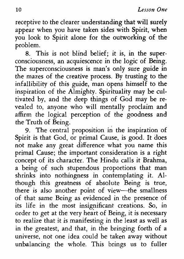 8. This is not blind belief; it is, in the superconsciousness, an acquiescence in the logic of Being. The superconsciousness is man's only sure guide in the mazes of the creative process. By trusting to the infallibility of this guide, man opens himself to the inspiration of the Almighty. Spirituality may be cultivated by, and the deep things of God may be revealed to, anyone who will mentally proclaim and affirm the logical perception of the goodness and the Truth of Being.