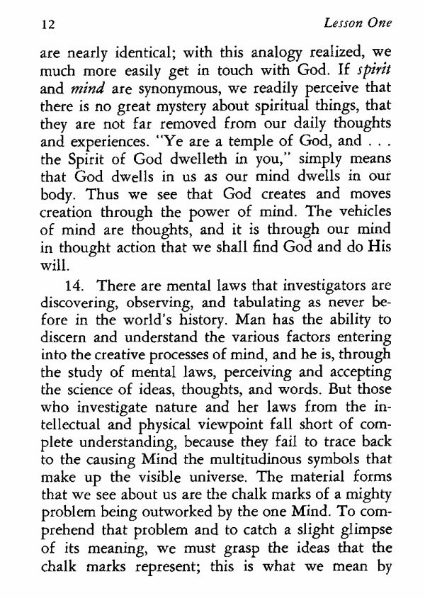 14. There are mental laws that investigators are discovering, observing, and tabulating as never before in the world's history. Man has the ability to discern and understand the various factors entering into the creative processes of mind, and he is, through the study of mental laws, perceiving and accepting the science of ideas, thoughts, and words. But those who investigate nature and her laws from the intellectual and physical viewpoint fall short of complete understanding, because they fail to trace back to the causing Mind the multitudinous symbols that make up the visible universe. The material forms that we see about us are the chalk marks of a mighty problem being outworked by the one Mind. To comprehend that problem and to catch a slight glimpse of its meaning, we must grasp the ideas that the chalk marks represent; this is what we mean