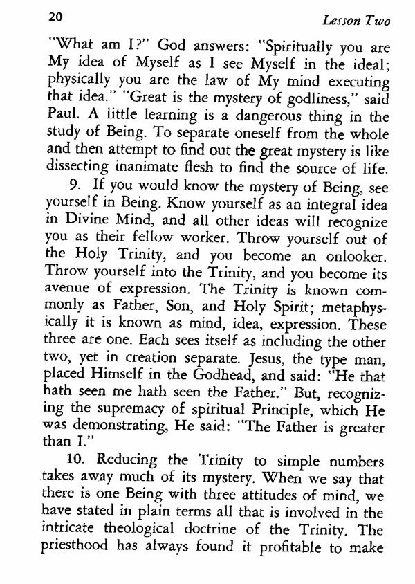 9. If you would know the mystery of Being, see yourself in Being. Know yourself as an integral idea in Divine Mind, and all other ideas will recognize you as their fellow worker. Throw yourself out of the Holy Trinity and you become an onlooker. Throw yourself into the Trinity and you become its avenue of expression. The Trinity is known commonly as Father, Son, and Holy Spirit; metaphysically it is known as mind, idea, expression. These three are one. Each sees itself as including the other two, yet in creation separate. Jesus, the type man, placed Himself in the Godhead, and said: "He that hath seen me hath seen the Father." But, recognizing the supremacy of spiritual Principle, which He was demonstrating, He said: "The Father is greater than I."