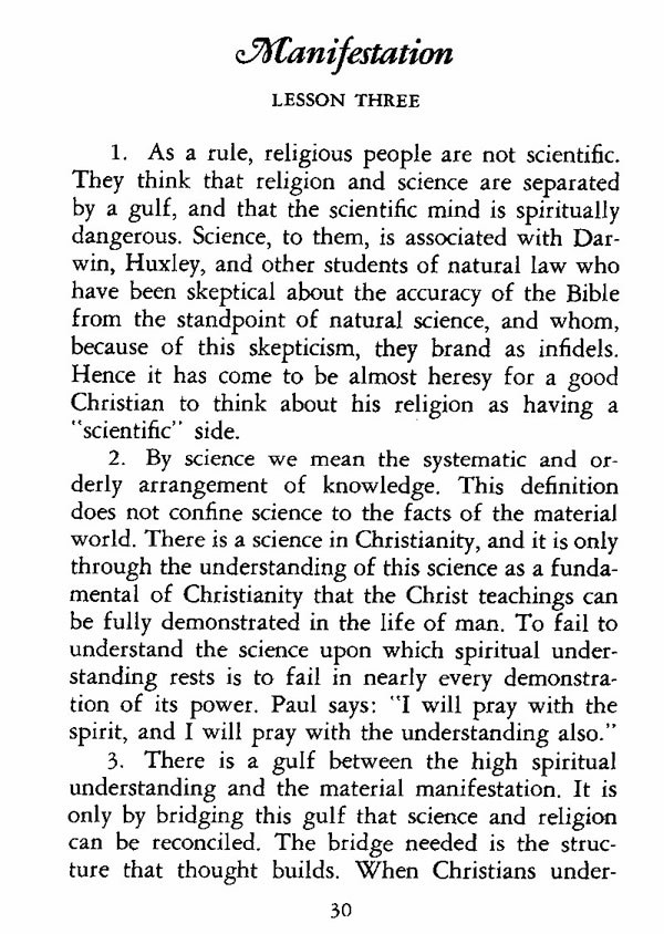 1. As a rule, religious people are not scientific. They think that religion and science are separated by a gulf, and that the scientific mind is spiritually dangerous. Science, to them, is associated with Darwin, Huxley, and other students of natural law who have been skeptical about the accuracy of the Bible from the standpoint of natural science, and whom, because of this skepticism, they brand as infidels. Hence it has come to be almost heresy for a good Christian to think about his religion as having a "scientific" side.