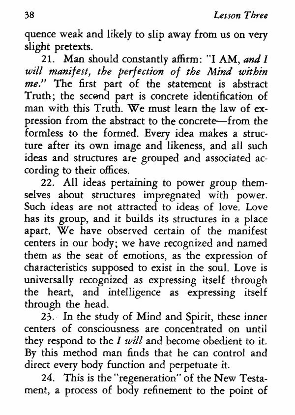 21. Man should constantly affirm: I AM, and I will manifest, the perfection of the Mind within me. The first part of the statement is abstract Truth; the second part is concrete identification of man with this Truth. We must learn the law of expression from the abstract to the concrete--from the formless to the formed. Every idea makes a structure after its own image and likeness, and all such ideas and structures are grouped and associated according to their offices.