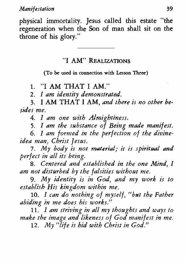 Contents: - Preface - The True Character of Being - Statements for the Realization of Divine Mind - Being's Perfect Idea - Statements for the Realization of the Son of God - Manifestation - "I AM" Realizations - Formative Power of Thought - Affirmations for Right Thinking - How to Control Thought - Cleansing and Purifying Statements - The Word - Power of Words - Spirituality or Prayer and Praise - Living Words to Quicken Spirituality - Establishing the Perfect Substance - Faith - Faith Affirmations - Imagination - Perfection in Form Established - Will and Understanding - Establishment of Will and Understanding - Judgment and Justice - Judgment and Justice Statements - Love - Love Demonstrated - Study Helps and Questions - Index -