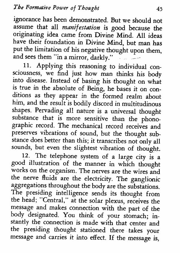 11. Applying this reasoning to individual consciousness, we find just how man thinks his body into disease. Instead of basing his thought on what is true in the absolute of Being, he bases it on conditions as they appear in the formed realm about him, and the result is bodily discord in multitudinous shapes. Pervading all nature is a universal thought substance that is more sensitive than the phonographic record. The mechanical record receives and preserves vibrations of sound, but the thought substance does better than this; it transcribes not only all sounds, but even the slightest vibration of thought.