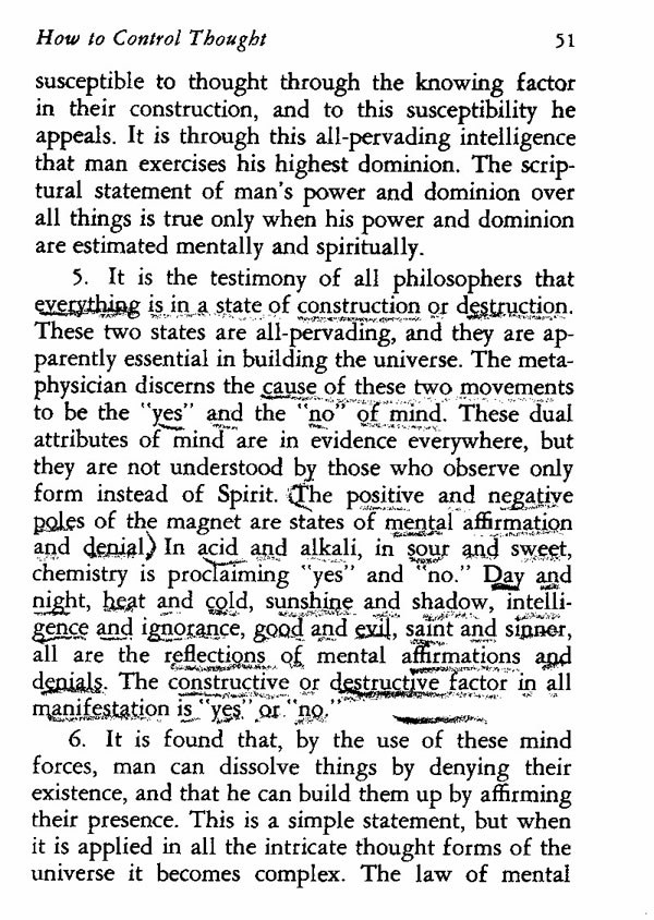 6. It is found that, by the use of these mind forces, man can dissolve things by denying their existence, and that he can build them up by affirming their presence. This is a simple statement, but when it is applied in all the intricate thought forms of the universe it becomes complex. The law of mental