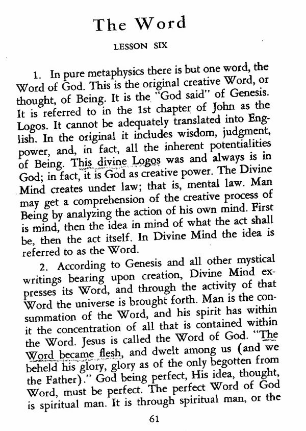 1. In pure metaphysics there is but one word, the Word of God. This is the original creative Word, or thought, of Being. It is the "God said" of Genesis. It is referred to in the 1st chapter of John as the Logos. It cannot be adequately translated into English. In the original it includes wisdom, judgment, power, and, in fact, all the inherent potentialities of Being. This divine Logos was and always is in God; in fact, it is God as creative power. The Divine Mind creates under law; that is, mental law. Man may get a comprehension of the creative process of Being by analyzing the action of his own mind. First is mind, then the idea in mind of what the act shall be, then the act itself. In Divine Mind the idea is referred to as the Word.