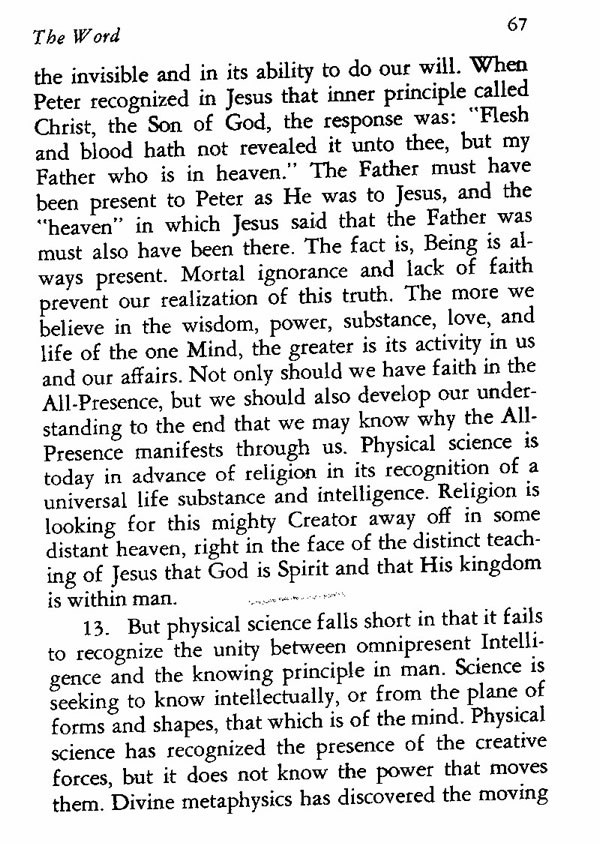 the invisible and in its ability to do our will. When Peter recognized in Jesus that inner principle called Christ, the Son of God, the response was: "Flesh and blood hath not revealed it unto thee, but my Father who is in heaven." The Father must have been present to Peter as He was to Jesus, and the "heaven" in which Jesus said that the Father was must also have been there. The fact is, Being is always present. Mortal ignorance and lack of faith prevent our realization of this truth. The more we believe in the wisdom, power, substance, love, and life of the one Mind, the greater is its activity in us and our affairs. Not only should we have faith in the All-Presence, but we should also develop our understanding to the end that we may know why the All-Presence manifests through us. Physical science is today in advance of religion in its recognition of a universal life substance and intelligence. Religion is looking for this mighty Creator away off in some distant heaven, right in the face of the distinct teaching of Jesus that God is Spirit and that His kingdom is within man.