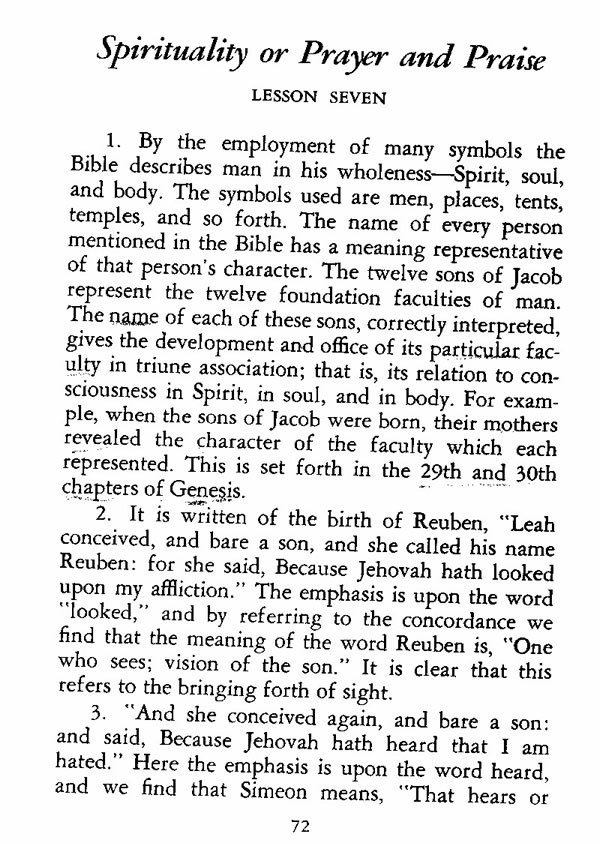 1. By the employment of many symbols the Bible describes man in his wholeness--Spirit, soul, and body. The symbols used are men, places, tents, temples, and so forth. The name of every person mentioned in the Bible has a meaning representative of that person's character. The twelve sons of Jacob represent the twelve foundation faculties of man. The name of each of these sons, correctly interpreted, gives the development and office of its particular faculty in triune association; that is, its relation to consciousness in Spirit, in soul, and in body. For example, when the sons of Jacob were born, their mothers revealed the character of the faculty which each represented. This is set forth in the twenty-ninth and thirtieth chapters of Genesis.