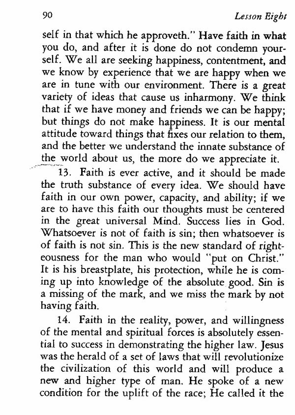 14. Faith in the reality, power, and willingness of the mental and spiritual forces is absolutely essential to success in demonstrating the higher law. Jesus was the herald of a set of laws that will revolutionize the civilization of this world and will produce a new and higher type of man. He spoke of a new condition for the uplift of the race; He called it the