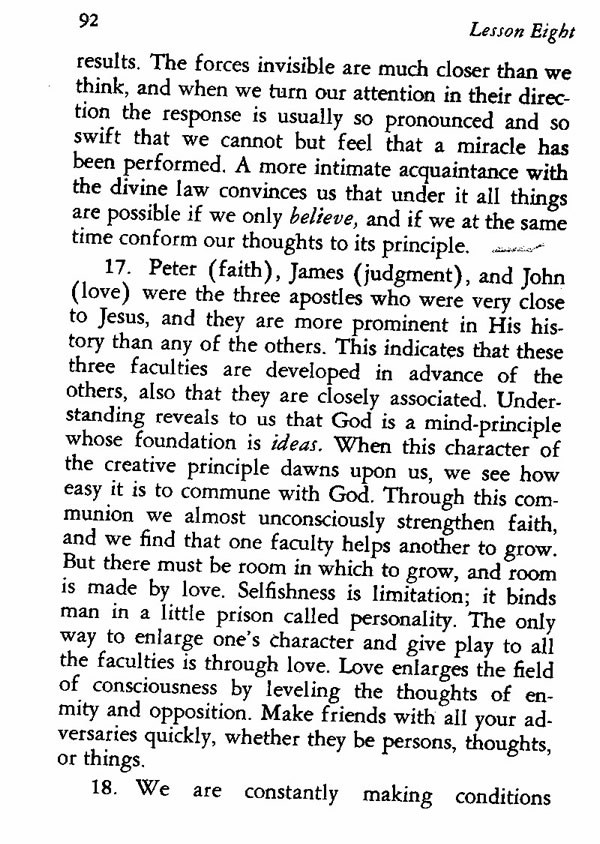 17. Peter (faith), James (judgment), and John (love) were the three apostles who were very close to Jesus, and they are more prominent in His history than any of the others. This indicates that these three faculties are developed in advance of the others, also that they are closely associated. Understanding reveals to us that God is a mind-principle whose foundation is ideas. When this character of the creative principle dawns upon us, we see how easy it is to commune with God. Through this communion we almost unconsciously strengthen faith, and we find that one faculty helps another to grow. But there must be room in which to grow, and room is made by love. Selfishness is limitation; it binds man in a little prison called personality. The only way to enlarge one's character and give play to all the faculties is through love. Love enlarges the field of consciousness by leveling the thoughts of enmity and opposition. Make friends with all your adversaries quickly, whether they be persons, thoughts, or things.
