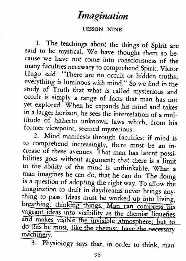 2. Mind manifests through faculties; if mind is to comprehend increasingly, there must be an increase of these avenues. That man has latent possibilities goes without argument; that there is a limit to the ability of the mind is unthinkable. What a man imagines he can do, that he can do. The doing is a question of adopting the right way. To allow the imagination to drift in daydreams never brings anything to pass. Ideas must be worked up into living, breathing, thinking things. Man can compress his vagrant ideas into visibility as the chemist liquefies and makes visible the invisible atmosphere; but to do this he must, like the chemist, have the necessary machinery.
