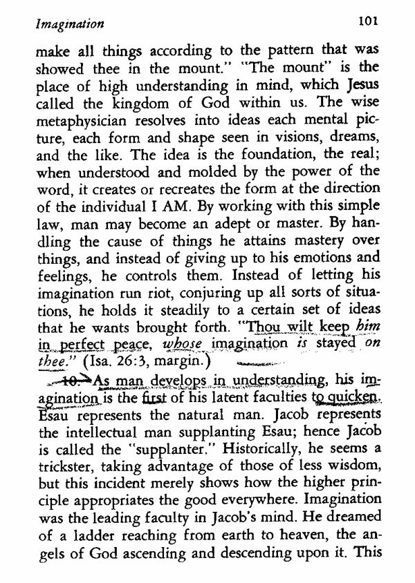 10. As man develops in understanding, his imagination is the first of his latent faculties to quicken. Esau represents the natural man. Jacob represents the intellectual man supplanting Esau; hence Jacob is called the "supplanter." Historically, he seems a trickster, taking advantage of those of less wisdom, but this incident merely shows how the higher principle appropriates the good everywhere. Imagination was the leading faculty in Jacob's mind. He dreamed of a ladder reaching from earth to heaven, the angels of God ascending and descending upon it. This