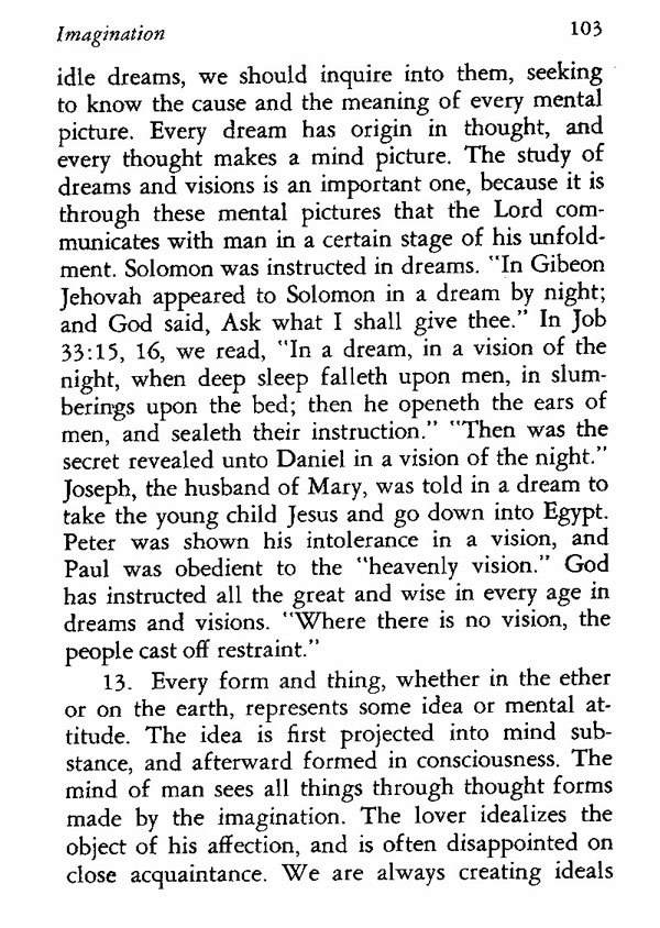 idle dreams, we should inquire into them, seeking to know the cause and the meaning of every mental picture. Every dream has origin in thought, and every thought makes a mind picture. The study of dreams and visions is an important one, because it is through these mental pictures that the Lord communicates with man in a certain stage of his unfoldment. Solomon was instructed in dreams. "In Gibeon Jehovah appeared to Solomon in a dream by night; and God said, Ask what I shall give thee." In Job 33:15, 16, we read, "In a dream, in a vision of the night, when deep sleep falleth upon men, in slumberings upon the bed; then he openeth the ears of men, and sealeth their instruction." "Then was the secret revealed unto Daniel in a vision of the night." Joseph, the husband of Mary, was told in a dream to take the young child Jesus and go down into Egypt. Peter was shown his intolerance in a vision, and Paul was obedient to the "heavenly vision." God has instructed all the great and wise in every age in dreams and visions. "Where there is no vision, the people cast off restraint."