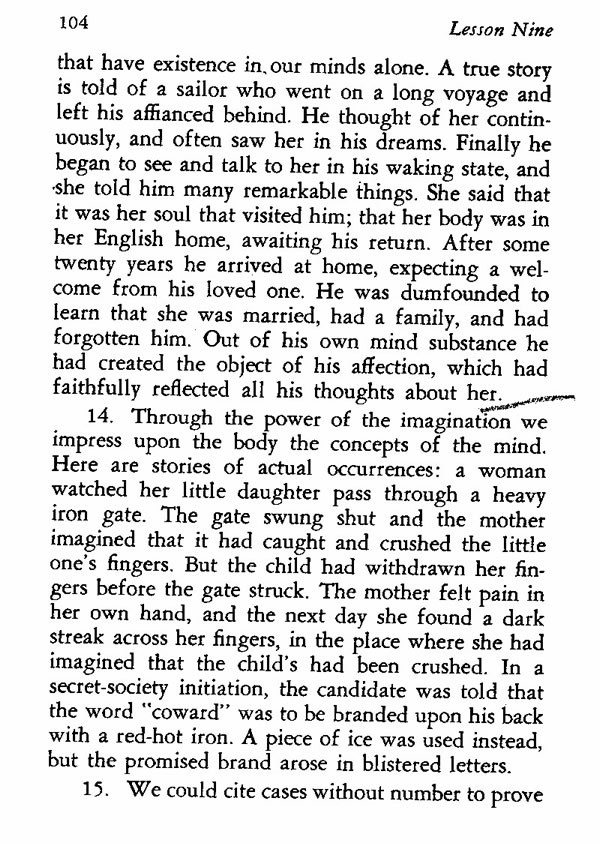 14. Through the power of the imagination we impress upon the body the concepts of the mind. Here are stories of actual occurrences: a woman watched her little daughter pass through a heavy iron gate. The gate swung shut and the mother imagined that it had caught and crushed the little one's fingers. But the child had withdrawn her fingers before the gate struck. The mother felt pain in her own hand, and the next day she found a dark streak across her fingers, in the place where she had imagined that the child's had been crushed. In a secret-society initiation, the candidate was told that the word "coward" was to be branded upon his back with a red-hot iron. A piece of ice was used instead, but the promised brand arose in blistered letters.