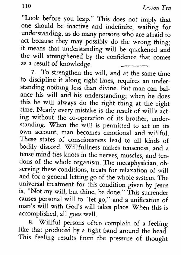 7. To strengthen the will, and at the same time to discipline it along right lines, requires an understanding nothing less than divine. But man can balance his will and his understanding; when he does this he will always do the right thing at the right time. Nearly every mistake is the result of will's acting without the cooperation of its brother, understanding. When the will is permitted to act on its own account, man becomes emotional and willful. These states of consciousness lead to all kinds of bodily discord. Willfullness makes tenseness, and a tense mind ties knots in the nerves, muscles, and tendons of the whole organism. The metaphysician, observing these conditions, treats for relaxation of will and for a general letting go of the whole system. The universal treatment for this condition given by Jesus is, "Not my will, but thine, be done." This surrender causes personal will to "let go," and a unification of man's will with God's will takes place. When this is accomplished, all goes well.