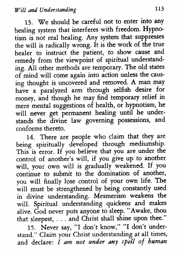 13. We should be careful not to enter into any healing system that interferes with freedom. Hypnotism is not real healing. Any system that suppresses the will is radically wrong. It is the work of the true healer to instruct the patient, to show cause and remedy from the viewpoint of spiritual understanding. All other methods are temporary. The old states of mind will come again into action unless the causing thought is uncovered and removed. A man may have a paralyzed arm through selfish desire for money, and though he may find temporary relief in mere mental suggestions of health, or hypnotism, he will never get permanent healing until he understands the divine law governing possessions, and conforms thereto.