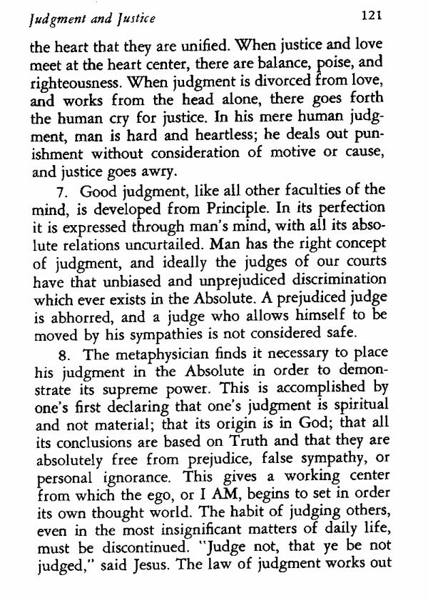 8. The metaphysician finds it necessary to place his judgment in the Absolute in order to demonstrate its supreme power. This is accomplished by one's first declaring that one's judgment is spiritual and not material; that its origin is in God; that all its conclusions are based on Truth and that they are absolutely free from prejudice, false sympathy, or personal ignorance. This gives a working center from which the ego, or I AM, begins to set in order its own thought world. The habit of judging others, even in the most insignificant matters of daily life, must be discontinued. "Judge not, that ye be not judged," said Jesus. The law of judgment works out