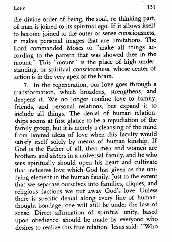 7. In the regeneration, our love goes through a transformation, which broadens, strengthens, and deepens it. We no longer confine love to family, friends, and personal relations, but expand it to include all things. The denial of human relationships seems at first glance to be a repudiation of the family group, but it is merely a cleansing of the mind from limited ideas of love when this faculty would satisfy itself solely by means of human kinship. If God is the Father of all, then men and women are brothers and sisters in a universal family, and he who sees spiritually should open his heart and cultivate that inclusive love which God has given as the unifying element in the human family. Just to the extent that we separate ourselves into families, cliques, and religious factions we put away God's love. Unless there is specific denial along every line of human-thought bondage, one will still be under the law of sense. Direct affirmation of spiritual unity, based upon obedience, should be made by everyone who desires to realize this true relation. Jesus said: "Who