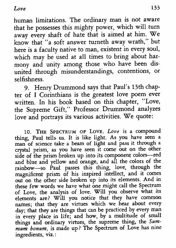 10. THE SPECTRUM OF LOVE. Love is a compound thing, Paul tells us. It is like light. As you have seen a man of science take a beam of light and pass it through a crystal prism, as you have seen it come out on the other side of the prism broken up into its component colors--red and blue and yellow and orange, and all the colors of the rainbow--so Paul passes this thing, love, through the magnificent prism of his inspired intellect, and it comes out on the other side broken up into its elements. And in these few words we have what one might call the Spectrum of Love, the analysis of love. Will you observe what its elements are? Will you notice that they have common names; that they are virtues which we hear about every day; that they are things that can be practiced by every man in every